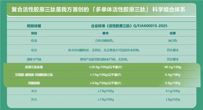 企业以自主研发为核心,聚焦健康原料关键技术突破,打造以活性胶原三肽为核心的产品矩阵。依托定向酶解技术实现小分子精准制备,产品分子量小于 500Da,活性成分占比超 40%,吸收效率为普通胶原肽的 4—15 倍,具备高活性、高吸收、高转化等核心优势,可广泛应用于营养保健、肌肤护理、骨骼健康等多元场景,精准匹配健康消费升级需求。目前该产品已完成海南省卫健委食品安全企业标准备案,以规范化研发与生产夯实行业竞争力。